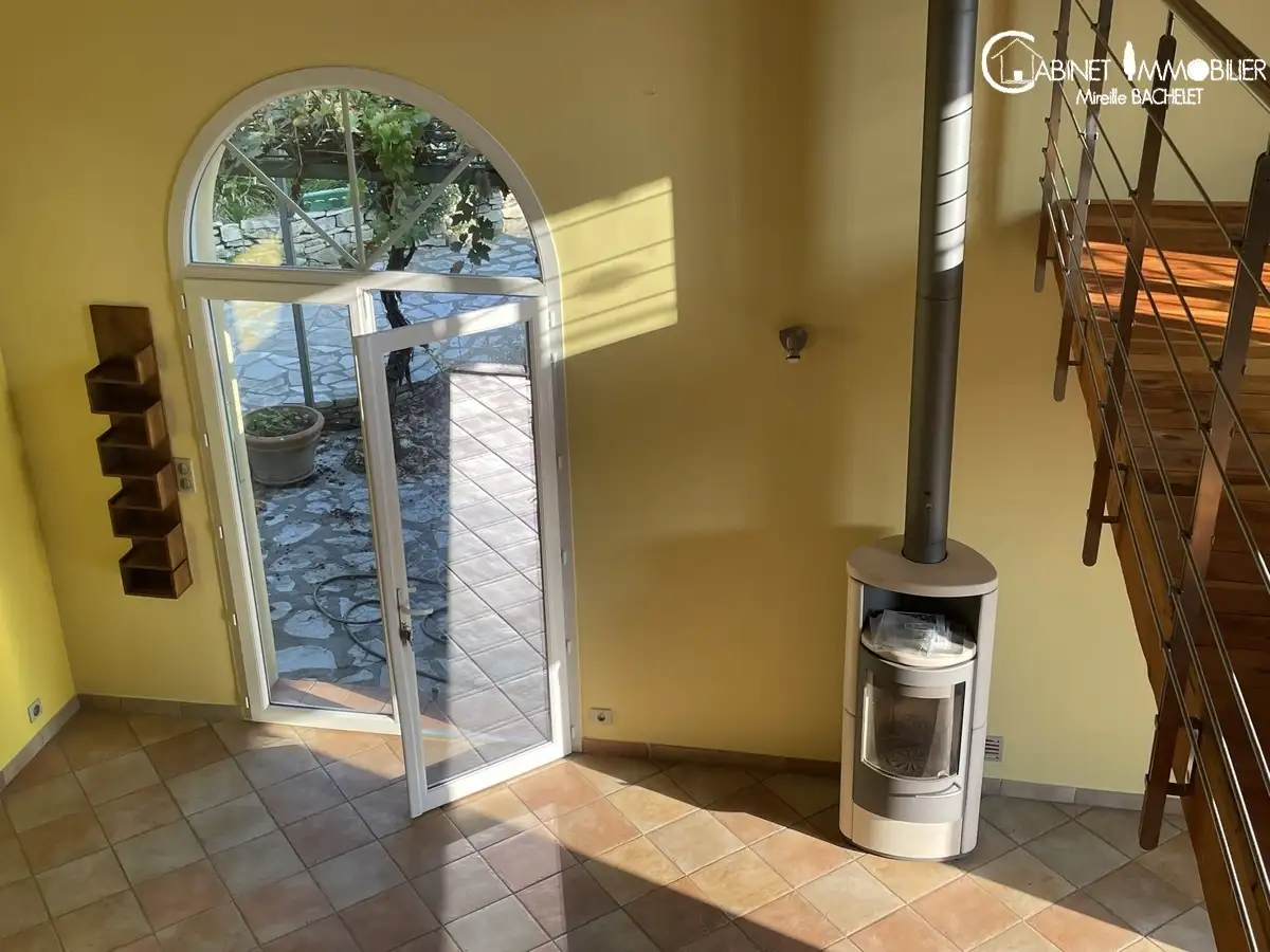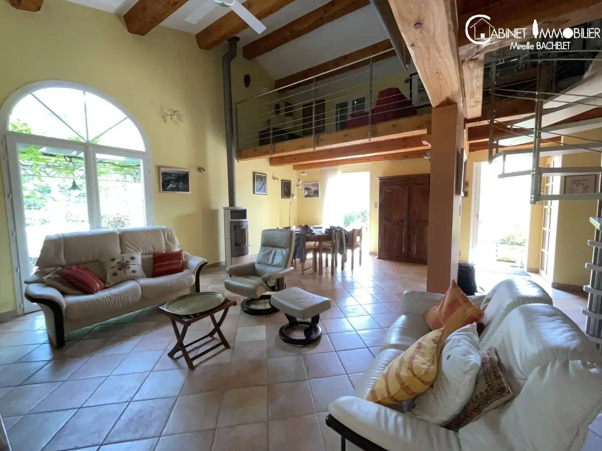 Le séjour très spacieux avec une grande hauteur de plafond a de nombreuses ouvertures sur le jardin , la terrasse au Sud avec un grand auvent pour l'été, la terrasse à l'est avec une treille, une fontaine...