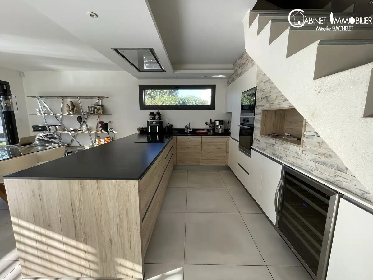 Au rez de chaussée, grand séjour avec cuisine ouverte équipée avec sortie sur jardin et terrasse avec pergola bio climatique de 2021 ; grande + suite parentale avec dressing, salle d'eau...Accès direct du rez de chaussée au garage.